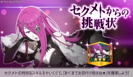 株式会社セガは、配信中の人気テレビアニメ「Re:ゼロから始める異世界生活」公式スマートフォン向けゲーム『Re:ゼロから始める異世界生活 Lost in Memories(以下、『リゼロス』)』にて、本日2022年11月14日(月)より強力なフィールド効果を発動するスキル4を所持した[フェスキャラ]「【気だるさに身を任せ】セクメト★3」が初登場する「フェスガチャ【気だるさに身を任せ】」、「気だるさに身を任せ」セクメトがボスとして登場する限定クエスト「セクメトからの挑戦状」を開催します。