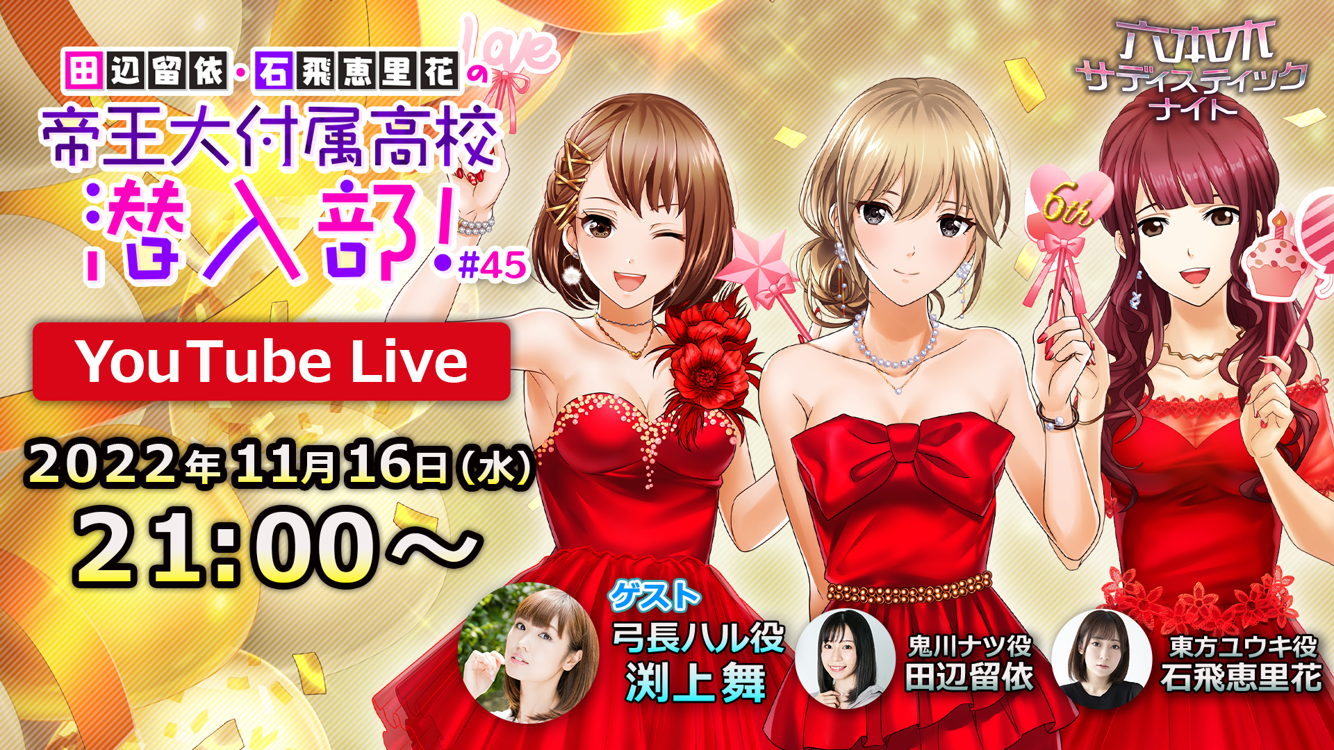 株式会社ボルテージ(本社:東京都渋谷区 代表取締役:津谷 祐司)は、現在配信中のカード型サスペンスアプリ「六本木サディスティックナイト」の公式YouTube番組「田辺留依・石飛恵里花の帝王大付属高校潜入部!#45」を11月16日(水)21:00より生配信することをお知らせいたします。