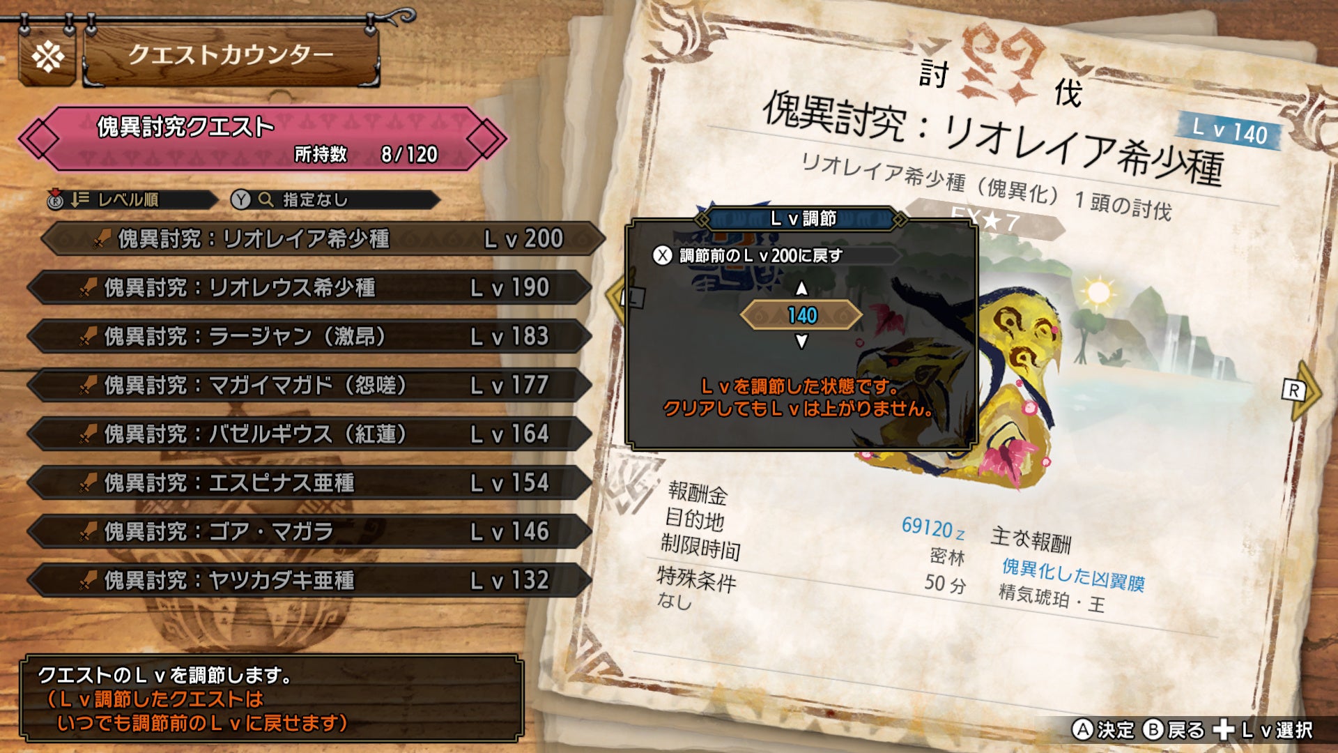 ターゲットモンスター、クエスト内容に応じたLvの範囲内で調節が可能。調節前より上げることはできません。
