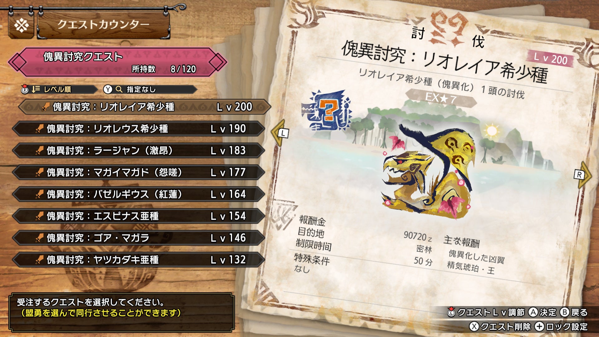 「渾沌に呻くゴア・マガラ」はMR10以上、「傀異克服クシャルダオラ」はMR120以上、「傀異克服テオ・テスカトル」は、MR140以上でクエストが受注可能となる。