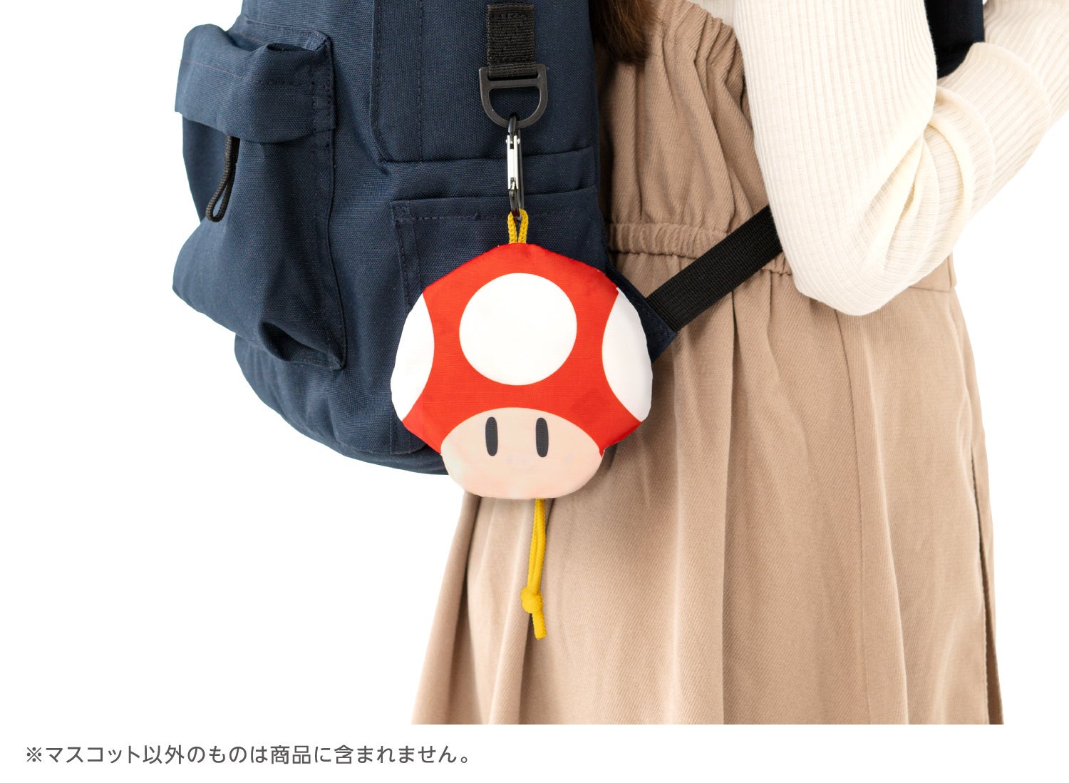 それぞれ「スーパーキノコ」「イカ」のマスコットに収納してコンパクトに持ち運ぶことができます。(マスコットはバッグと一体型です。)マスコットには吊り下げ用のループが付いていますので、リュックサックなどにぶらさげることもできます。