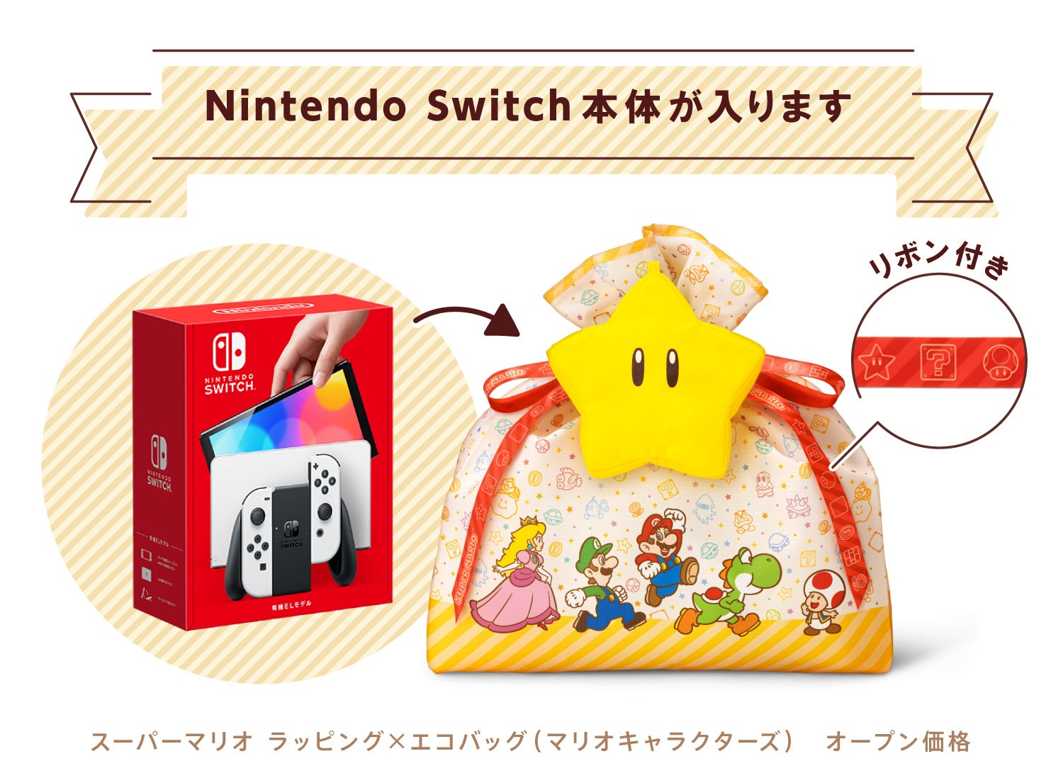 「ラッピング×エコバッグ(マリオキャラクターズ)」はスーパースター型のポーチが付属した、クリスマスプレゼントをにぎやかに演出するのにぴったりなバッグです。Nintendo Switchシリーズ本体のラッピングにもちょうどいいサイズです。