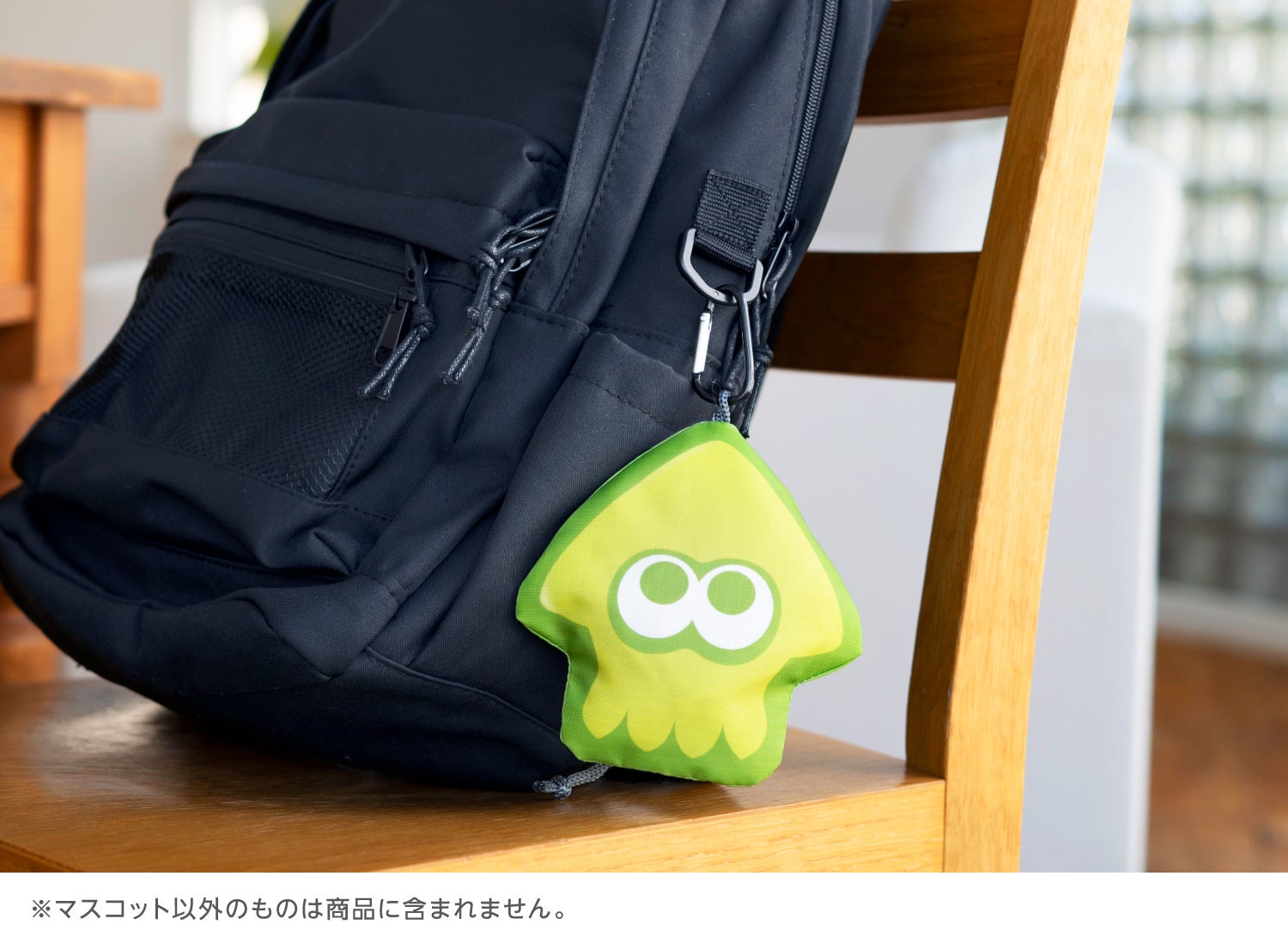それぞれ「スーパーキノコ」「イカ」のマスコットに収納してコンパクトに持ち運ぶことができます。(マスコットはバッグと一体型です。)マスコットには吊り下げ用のループが付いていますので、リュックサックなどにぶらさげることもできます。