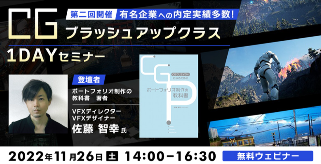 当日は、「CGブラッシュアップクラス」の受講生が登壇し、受講生たちの制作したポートフォリオを公開するほか、本コースの受講のきっかけなどについてもお話します。また、ご希望の方には、本コースの講師を務め、『CGクリエイターになるためのポートフォリオ制作の教科書』の著者でもある佐藤智幸氏によるポートフォリオ添削も予定しております。「CGブラッシュアップクラス」の受講をご検討中の方はもちろんのこと、内定を獲得したポートフォリオ・CG作品が見たい方、将来ゲームクリエイターをめざしている方などにおすすめの内容です。