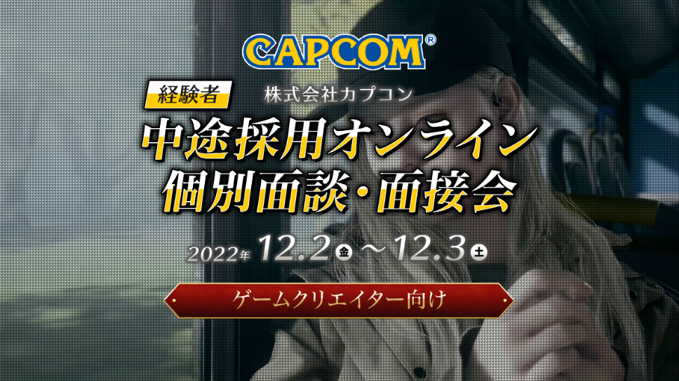 株式会社クリーク・アンド・リバー社(C&R社)は12月2日(金)・3日(土)の2日間、ゲームクリエイターの方々を対象に、株式会社カプコンの中途採用オンライン個別面談・面接会を開催いたします。