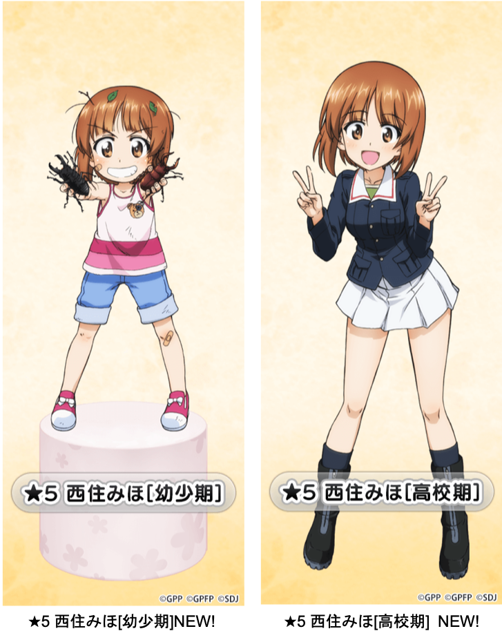 本ガチャには、アニメ10周年記念描き下ろしイラストの★5 西住みほ[幼少期]と★5 西住みほ[高校期]が登場いたします。ぜひご確認ください。
