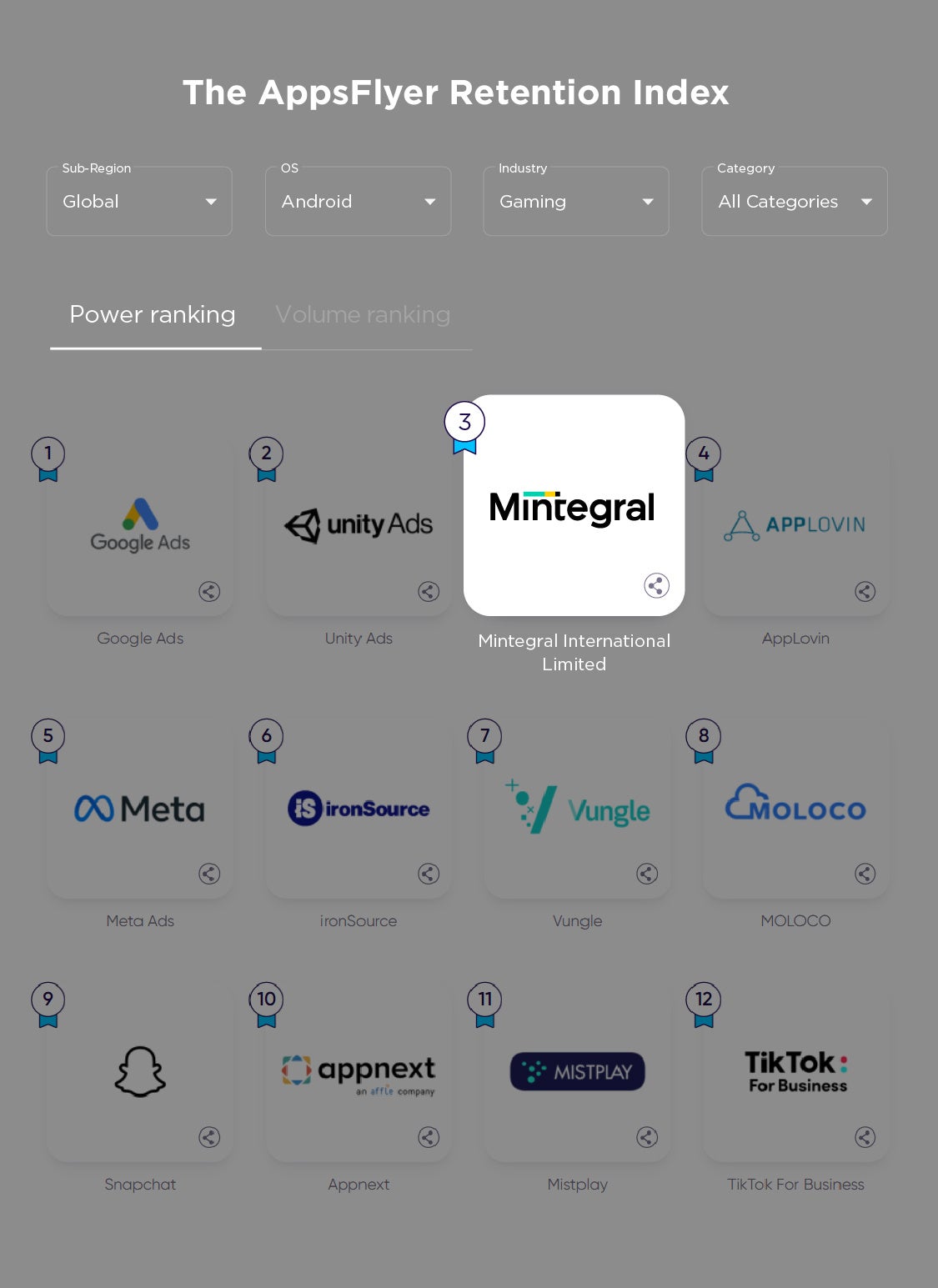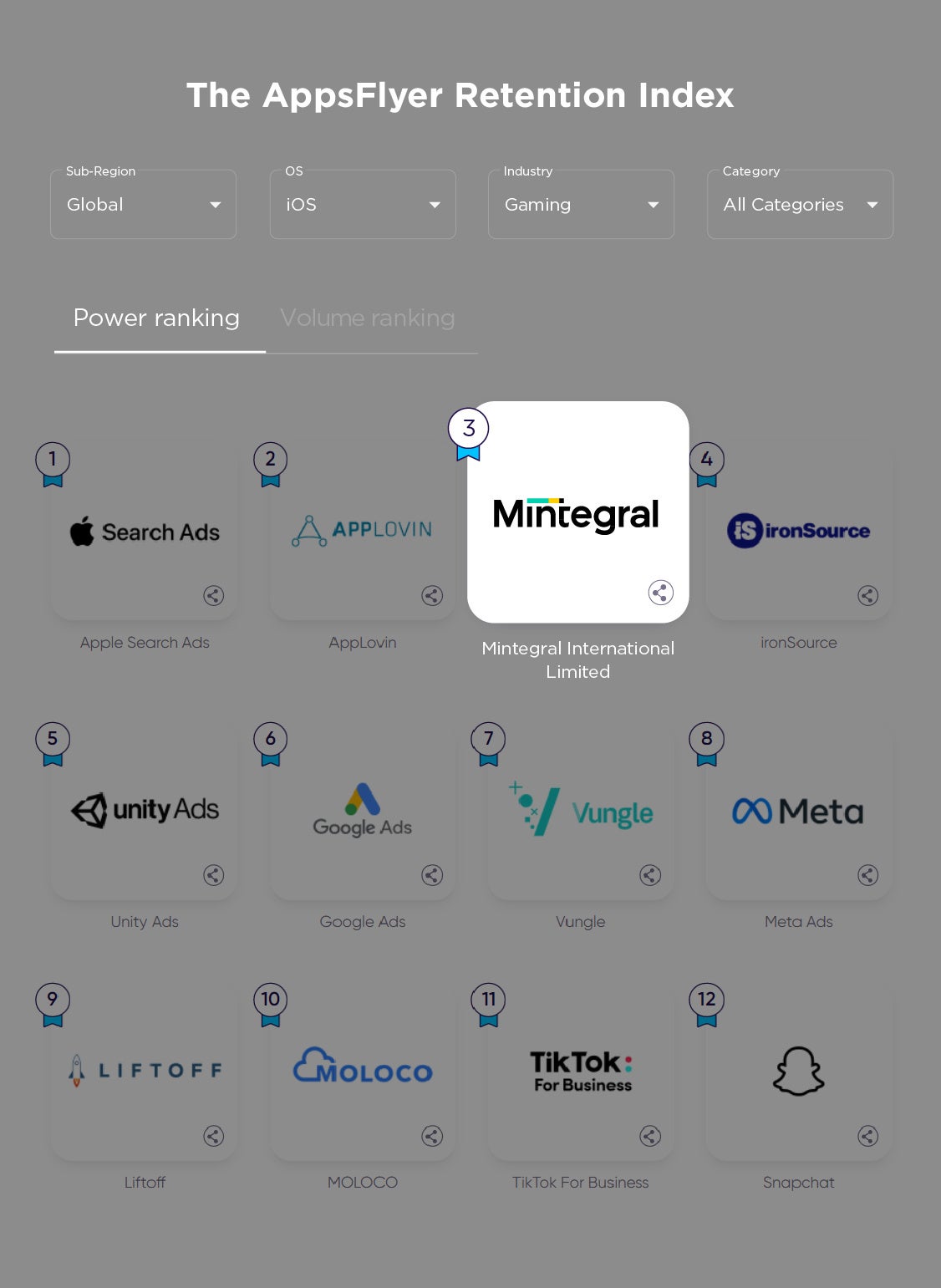 iOSのカテゴリー別リテンションインデックスと同様に、iOSのゲームトラックリテンションインデックスで高い数字を維持しているのはAppLovin、Mintegral、ironSourceで、中でもMintegralの上昇が最も著しく、実力チャートでは1ランクアップして第3位、規模チャートでは3ランクアップして第3位を獲得しました。