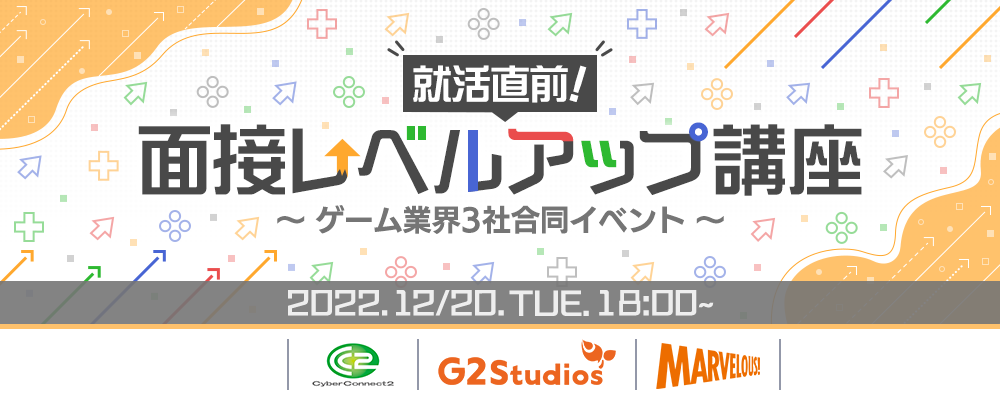 今回のイベントは、G2 Studios、サイバーコネクトツー、マーベラスの3社による、ゲーム業界を目指す学生向けのイベントです。ゲーム業界についての基本的な情報や、各社の魅力などをお伝えすることで、ゲーム業界への理解を深め、業界・企業分析の一助となる内容をお届けします。また、参加者の皆さんの今後の就職活動に少しでもお役立ていただけるようなイベントになるよう、面接官が見ているポイントやオンラインとオフライン面接の違いなどをお伝えする面接講座も実施いたします。ゲーム業界にご興味のある学生の皆様からのご参加をお待ちしております。