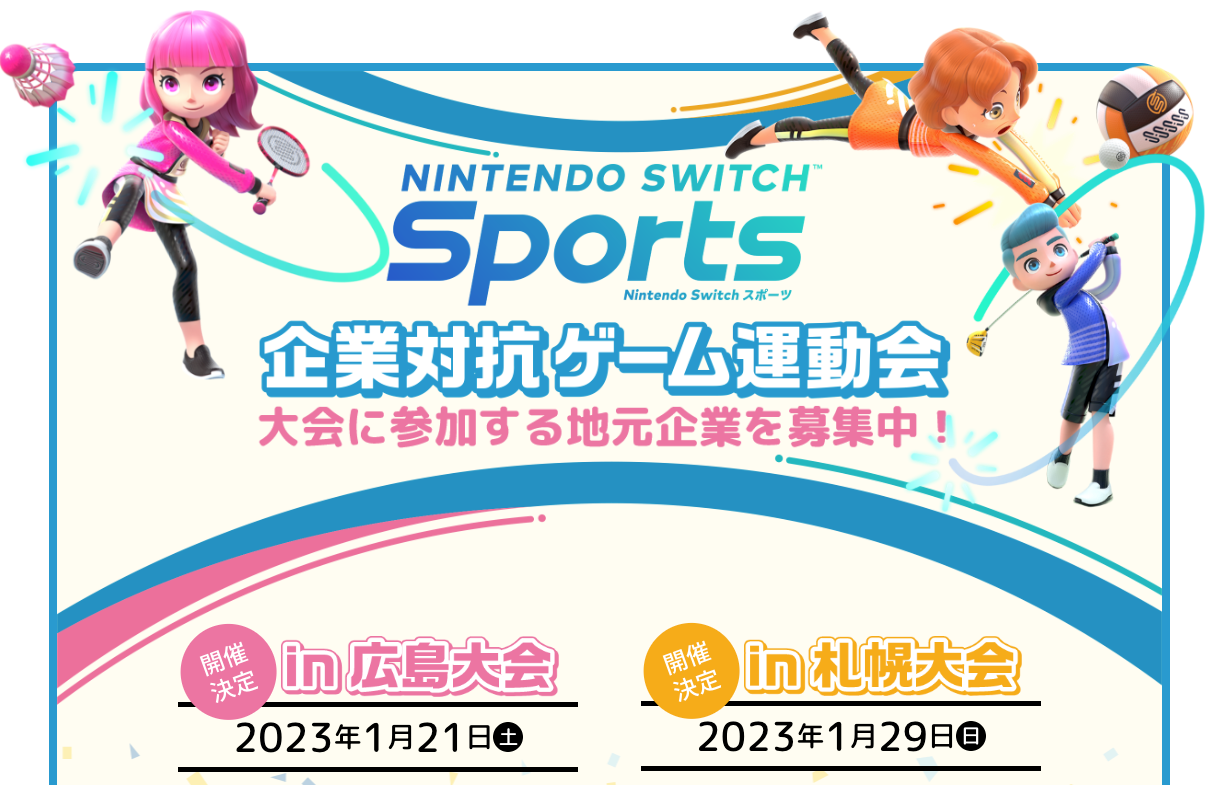 “『Nintendo Switch Sports』企業対抗ゲーム運動会”は、Nintendo Switch™専用ソフト『Nintendo Switch Sports』を使用した企業対抗のゲーム大会です。2023年1月21日(土)に広島、1月29日(日)に札幌で開催します。
