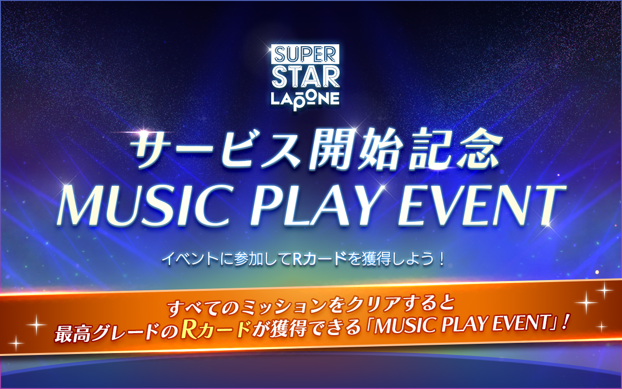 サービス開始を記念して、毎日ログインするとカード17枚分のダイヤが手に入る「ログインボーナス」と、すべてのミッションをクリアすると最高グレードのRカードが獲得できる「MUSIC PLAY EVENT」を開催しております。是非、この機会にお楽しみください。