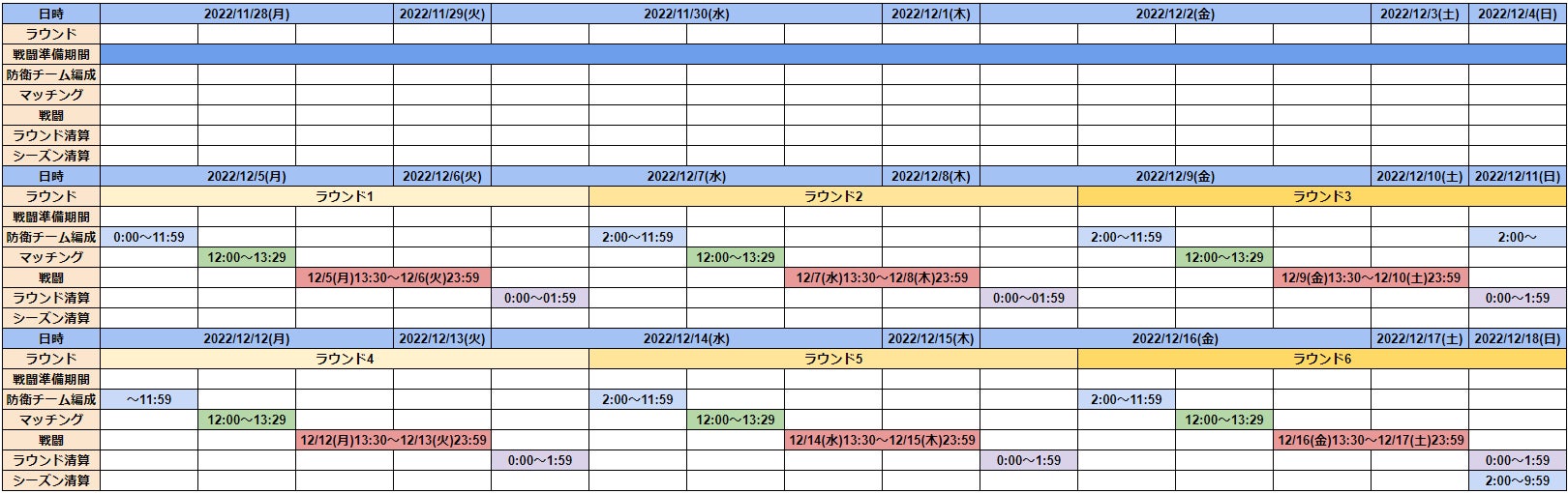 複数のギルドと対戦し、シーズン中に相手の防御チームを倒し、より多くのスコアを獲得したギルドが勝利となります。