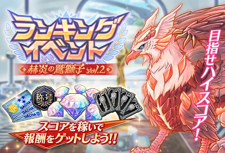 ランキングイベント「赫炎の鷲獅子 vol.2」開催! 制限時間内にボスに与えたダメージに応じてスコアが決定し、スコアに応じて様々な報酬を獲得して他のプレイヤーと競い合いましょう! 今回のボスは「炎」属性となりますので、「氷」属性のパーティで挑んでみてください。