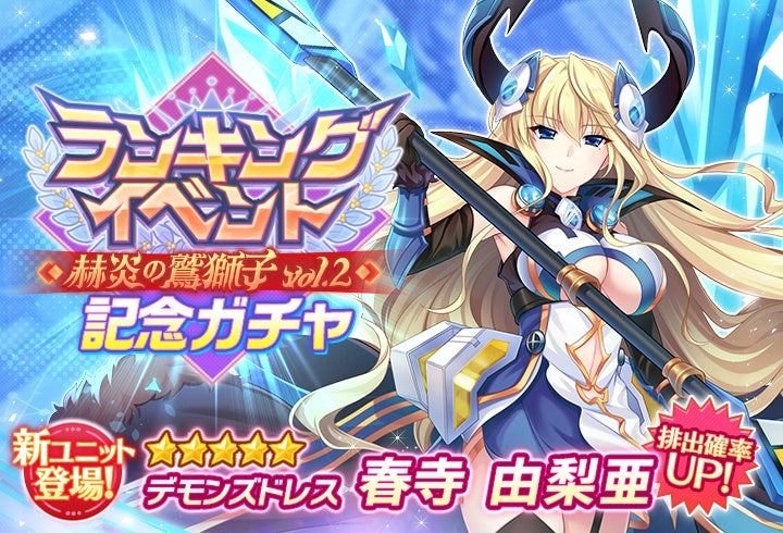新ユニットとして「デモンズドレス 春寺 由梨亜」がピックアップガチャに登場!エネミー全体に大きなダメージを与え、更に自身のスキルダメージをアップさせるアタッカー!「赫炎の鷲獅子 vol.2」で大活躍間違いなしのユニットです!期間限定で排出確率アップ中のこの機会に獲得し、イベントに挑んでみてください。