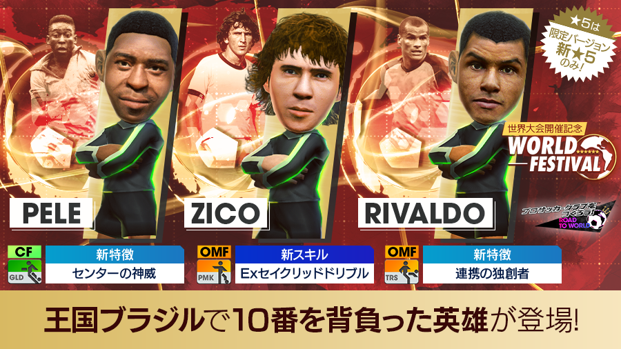 レジェンド「ジーコ」、「ペレ」、「リバウド」、をはじめとした南米のスーパースターたちが新★5選手として登場する特典付きの特別なスカウトです。