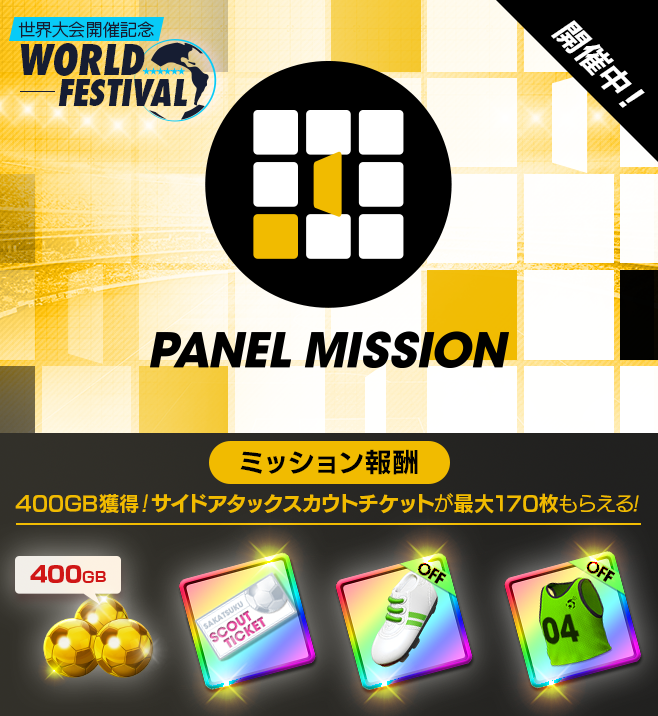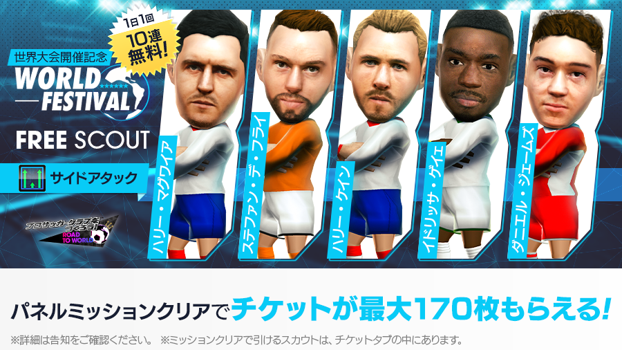 南米セレクションスターズの選手を編成すると強くなるフォーメーションコンボ「太陽の戦士たち」を持つ新★5監督「トレサンタノ」を獲得できる特別なログインボーナスをはじめ、得意戦術「サイドアタック」のスター選手たちが登場する1日1回無料の10連スカウトや、「サイドアタックスカウトチケット」で引くことができる“世界大会開催記念TICKET SCOUTサイドアタック”、豪華報酬が獲得できるパネルミッションなどが期間限定で登場します。どうぞお見逃しなく!