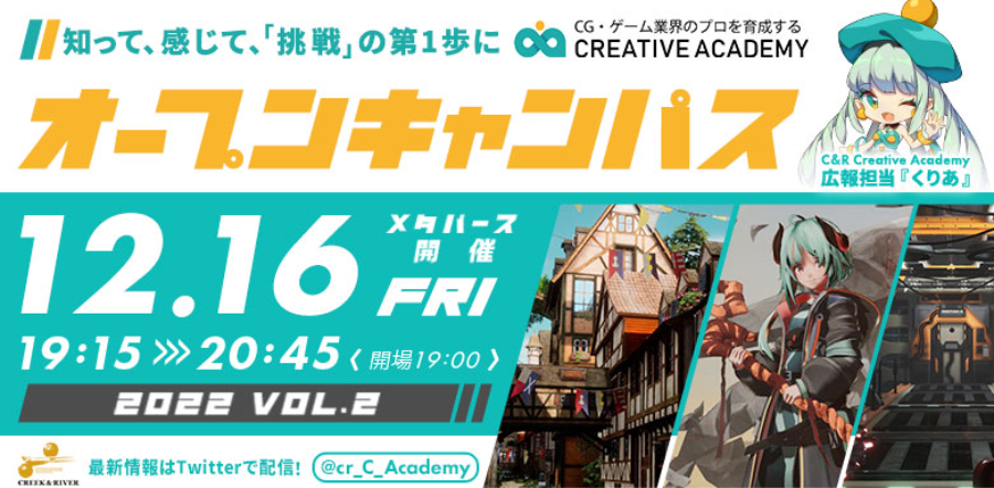 株式会社クリーク・アンド・リバー社(C&R社)が運営する未経験者のためのゲームクリエイター育成プログラム「C&R Creative Academy」は12月16日(金)、同プログラムにご興味をお持ちの方や、未経験からゲーム業界でクリエイターとして活躍したい方などを対象に、メタバース空間「oVice(オヴィス)」において、オープンキャンパスを開催いたします。