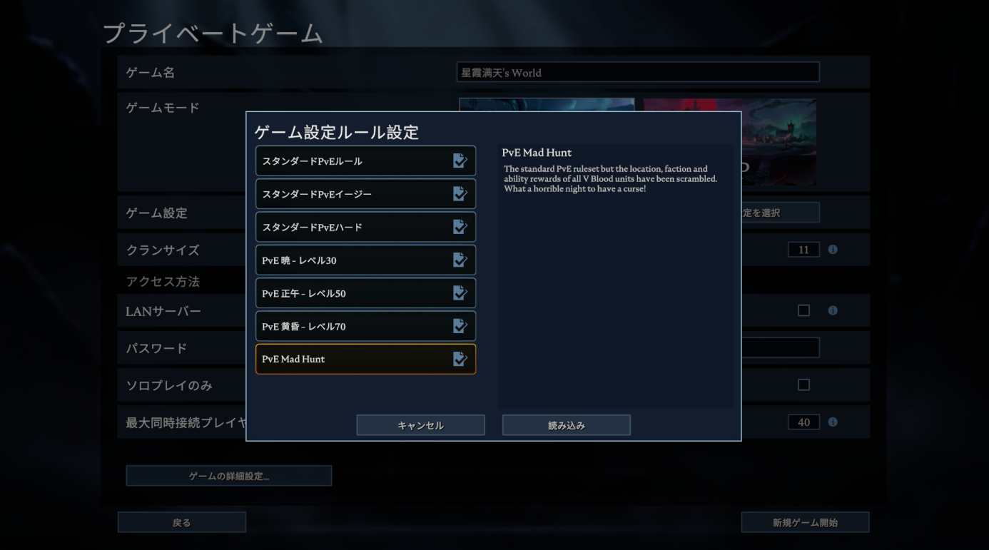 『V Rising』には通常のゲームモード以外に、近日実装されたランダム性の高い「クレイジー・ハンティング」モードがあります。本モードではランダム生成されたVブラッドの強敵に遭遇します。敵は思いがけないスポットに出現し、撃破後の獲得フォームとアビリティも通常と異なります。