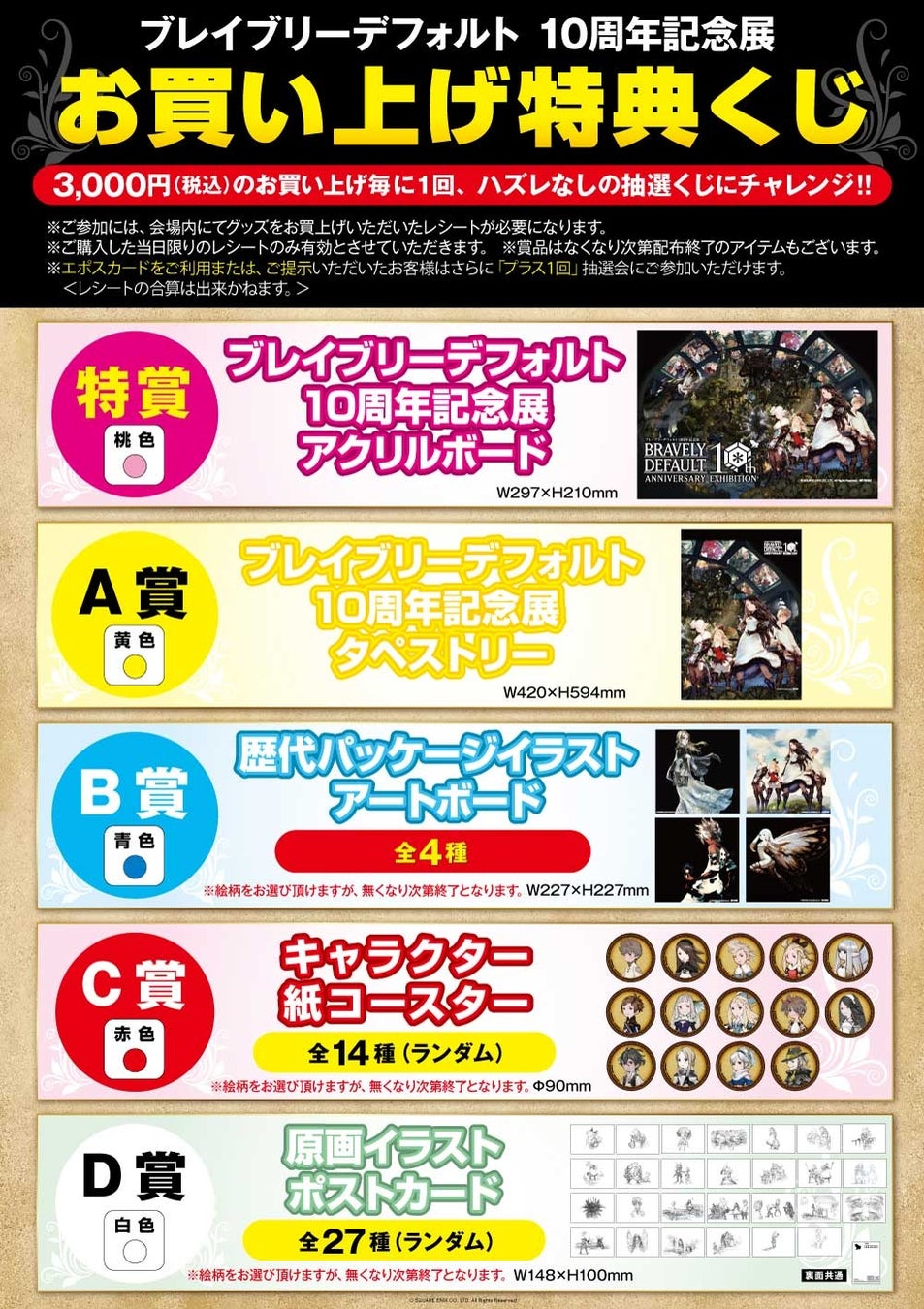 開催期間中、ブレイブリーデフォルト10周年記念展グッズご購入3,000円(税込)毎に1回、豪華賞品が当たる抽選会にご参加いただけます。