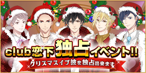12月5日(月)~12月11日(日)の各キャストの週間親密度ランキング1位になれた貴女のみが、12月24日(土)にclub恋下に入室出来ます☆つまり、大好きな彼をclub恋下でも独占できる大チャンス♡甘いひと時を過ごしたいなら絶対参加して♡