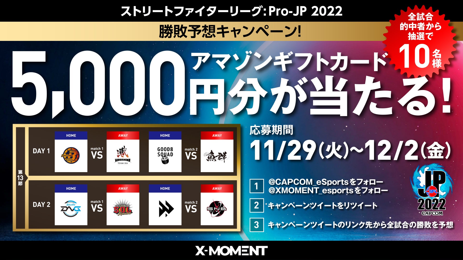 - 「ストリートファイターリーグ: Pro-JP 2022」第13節勝敗予想キャンペーン実施中!