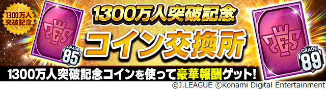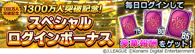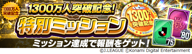 株式会社コナミデジタルエンタテインメントは、モバイルゲーム『Jリーグクラブチャンピオンシップ』(以下、『Jクラ』)の登録会員数1300万人突破を記念したキャンペーンを開始したことをお知らせします。