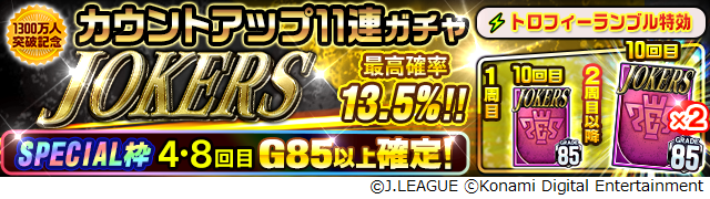 本キャンペーンでは、期間中毎日ログインするだけで「G85以上ガチャ券」などが獲得できる「1300万人突破記念!スペシャルログインボーナス」や、試合に途中から出場して活躍した各クラブの選手、総勢40名が「ジョーカー」カードとして登場します。