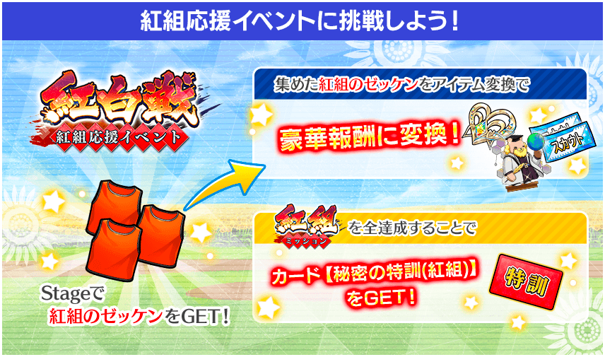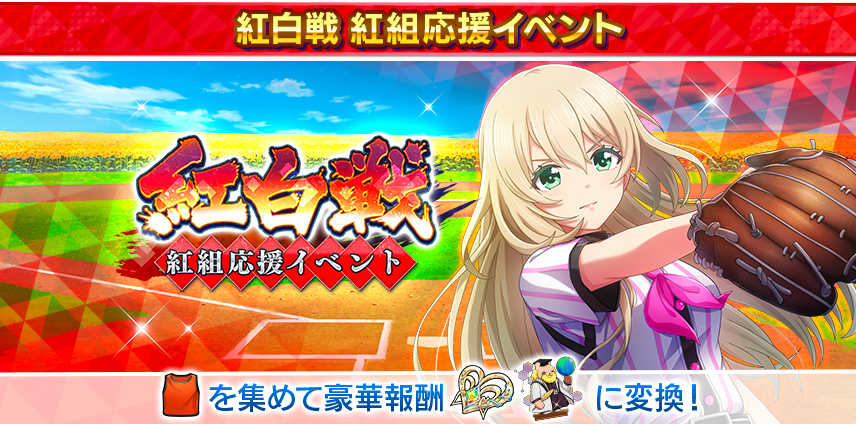 本日より、紅組応援イベントを開催いたします。Stageをクリアして「紅組のゼッケン」を集めていただくと、絆の結晶 (極) をはじめとしたゲーム内アイテムに変換可能です。