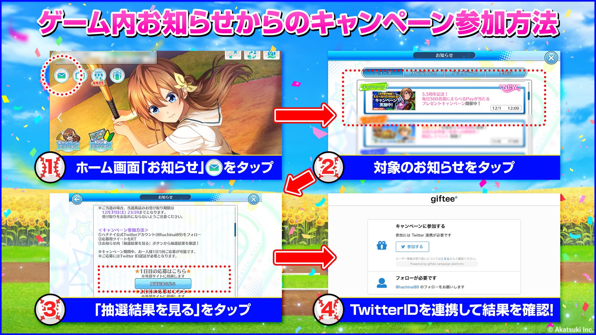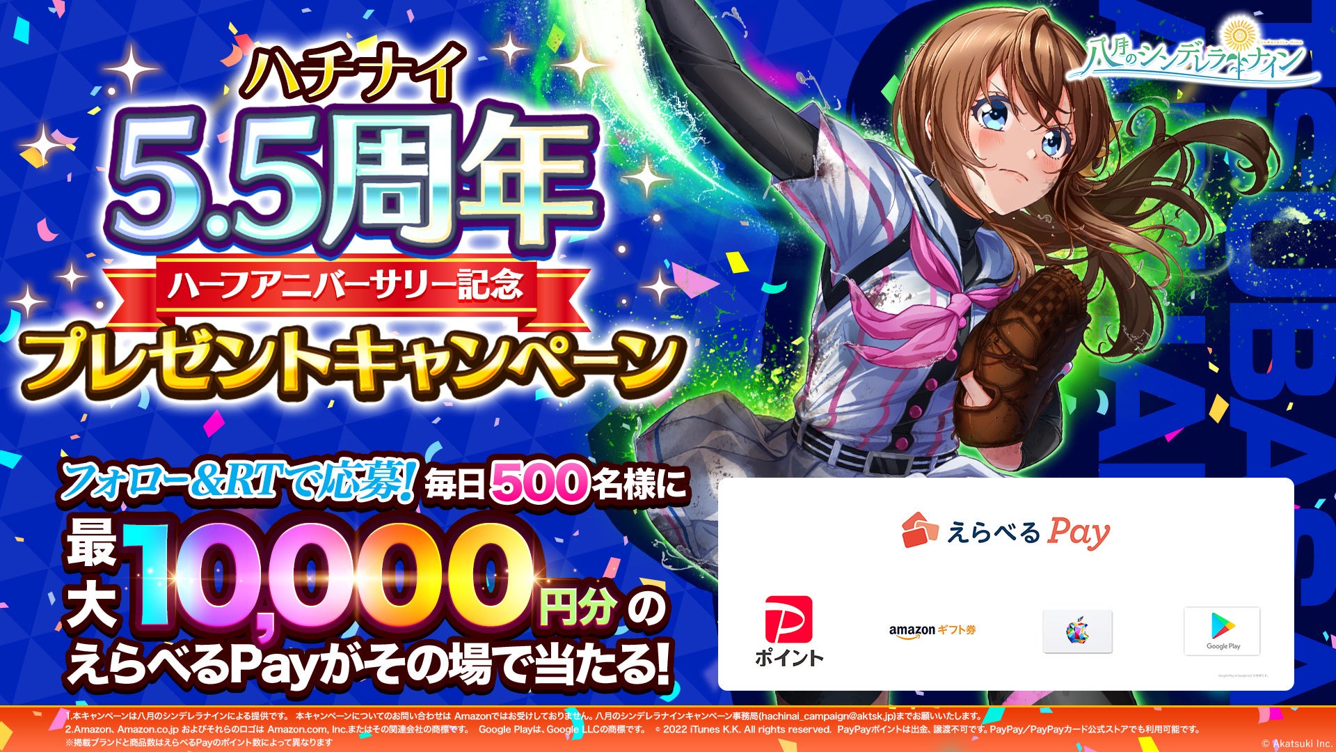 2022年12月1日(木)より4日間、ハチナイ公式Twitterにて毎日500名様に最大10,000円分のえらべるPayが当たる「ハチナイ5.5周年はーフアニバーサリー記念プレゼントキャンペーン」を開催いたします。
