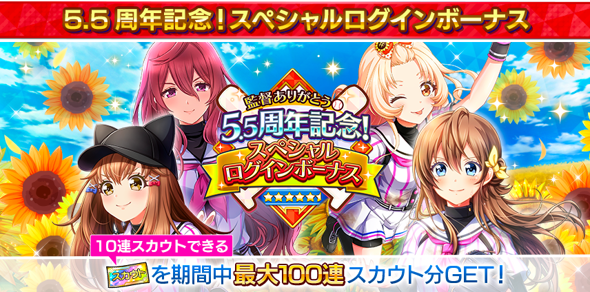 ハーフアニバーサリーを記念して、ログインで最大100連分の無料スカウトを引くことのできるチケットをプレゼントいたします。また、2022年11月22日(火)より実施した「全監督合同ミッション」の達成報酬として、2022年12月1日(木)に100連分の無料スカウトを引くことのできるチケットをプレゼントいたします。