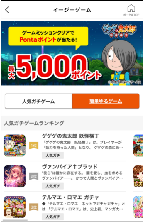 従来の簡単ゆるゲーム(広告型ゲーム)約200タイトルに加えて、人気ガチゲーム「ゲソてん byGMO」の「ゲゲゲの鬼太郎 〜妖怪横丁〜」や「城姫クエスト 極」などの人気のフリーミアム※型ゲーム約50タイトルも提供し、今後もタイトル数を充実させていくことで、より多様なニーズへ対応が可能になります。また、「イージーゲーム」内の決済などで獲得したPontaポイントは、ゲーム内の課金のほか、ほかのサービスや日常の店舗などで利用できます。