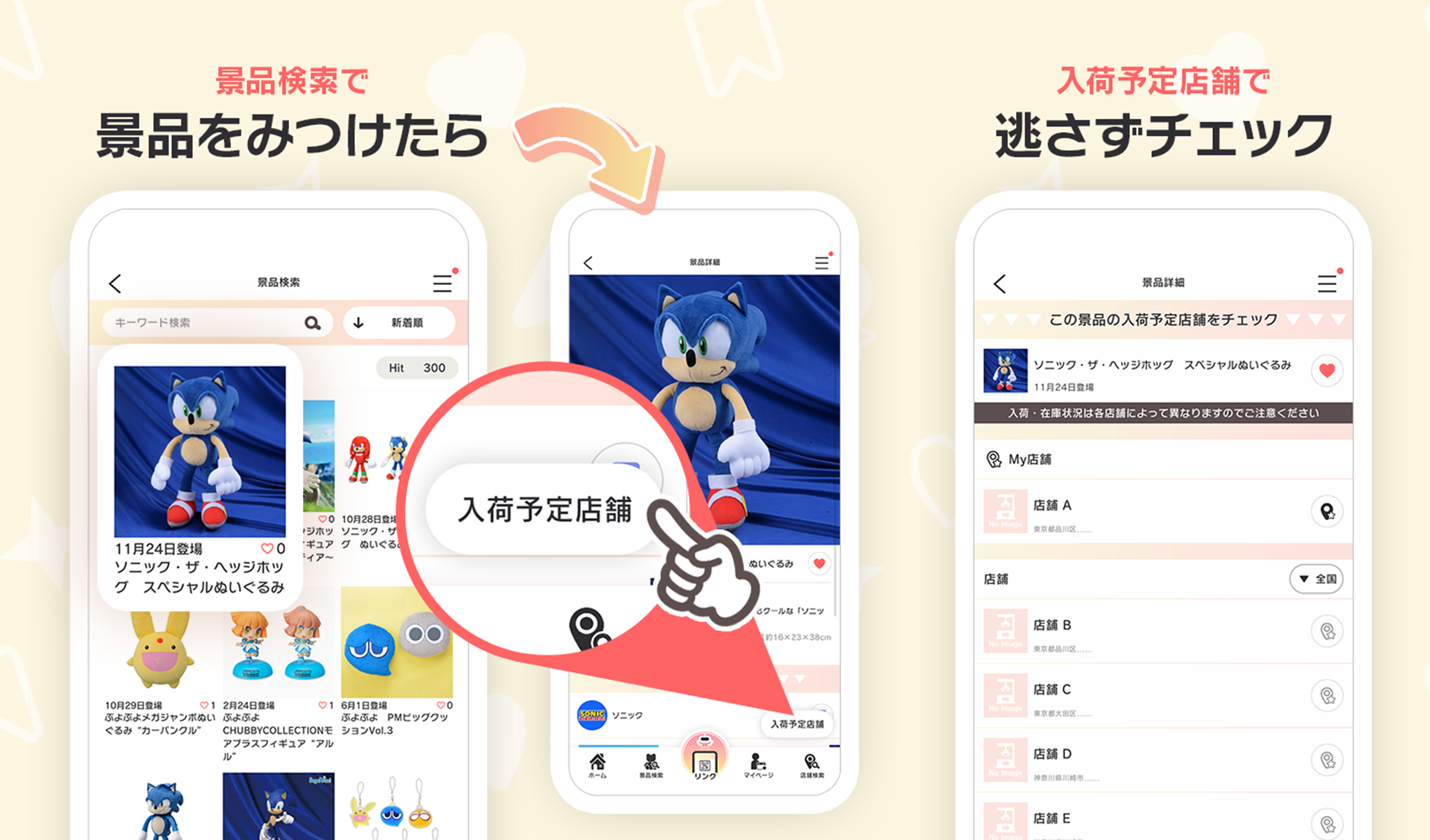 プライズの情報だけでなく、検索したプライズ情報から最寄りの入荷店舗も簡単に確認可能。欲しいプライズの情報から、それが“いつ”“どこにあるのか”まで、気になる情報の収集をシンプルな機能でサポートします。