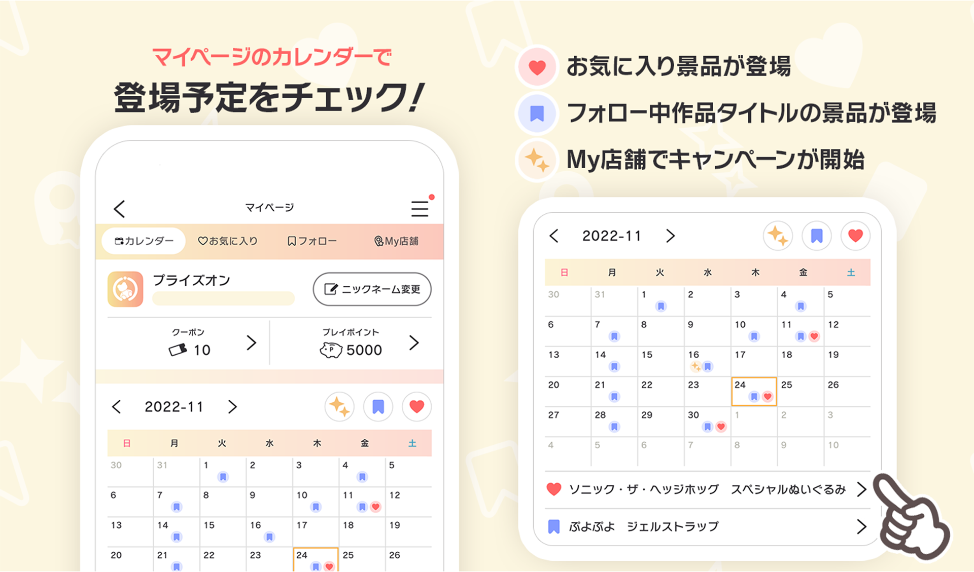 さらに、気になるプライズ(景品)から入荷予定店舗を検索したり、作品タイトルごとにブックマークできる機能も搭載。ブックマークしたプライズや作品タイトルは自動的にMyカレンダーに登録・通知されるため、欲しいプライズ情報を逃しません。