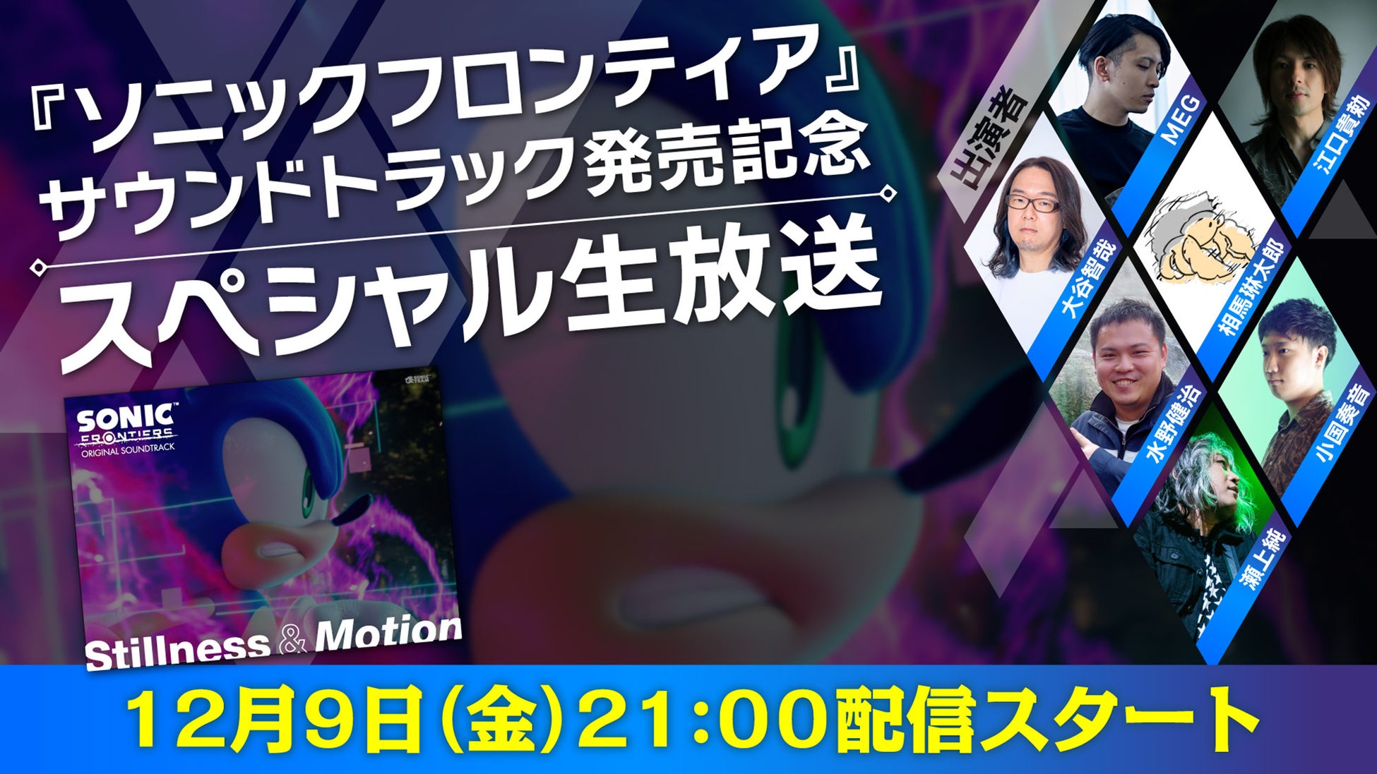 株式会社セガは、好評発売中のPlayStation®5/PlayStation®4/Nintendo Switch™/Xbox Series X|S/Xbox One/PC(Steam)用ソフト『ソニックフロンティア』のオリジナルサウンドトラック「Sonic Frontiers Original Soundtrack Stillness & Motion」の発売を記念した特别番組を、2022年12月9日(金)21時よりYouTube Liveにて生放送します。