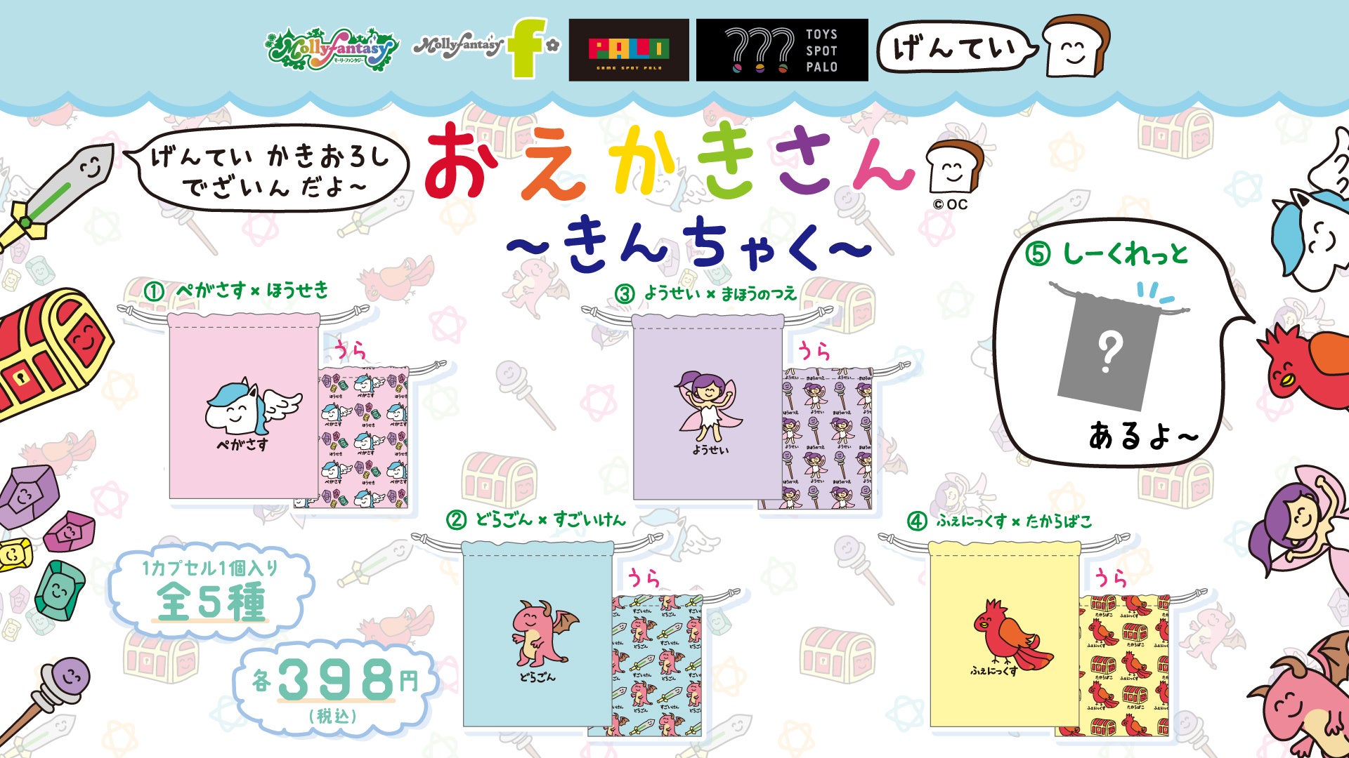 オクタニコーポレーションが企画する「おえかきさんシリーズ」より、今回のために描きおろしたデザインの「おえかきさん ~きんちゃく~」がカプセルトイになって登場。「ぺがさす×ほうせき」などファンタジーをテーマにしたモーリーファンタジー・PALO限定のオリジナルデザイン全5種を展開します。