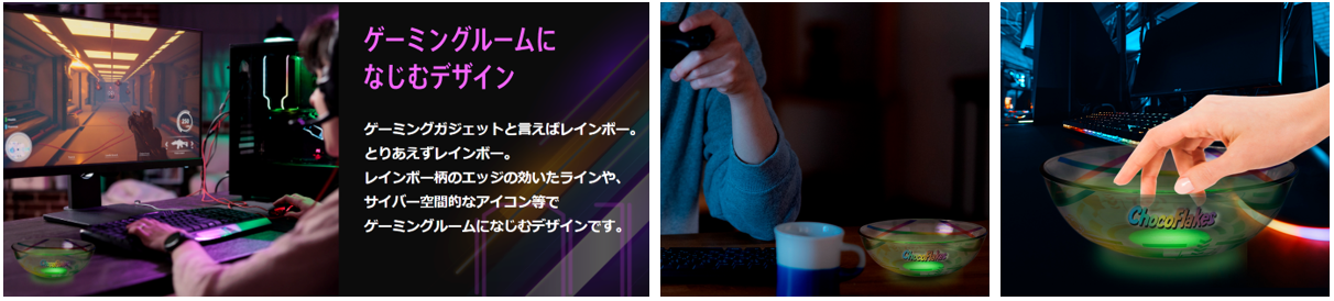 特長はゲーミングガジェットらしいレインボーカラー。さらにボウル底部に蓄光素材を使用することで、さながらRPGのセーブポイントのようにまばゆい光を放ちます。ゲーマーの皆様の自慢のゲーミングルームに合うデザインを目指しました。ゲーム中、指に付いたチョコが気になったら、水を張ったフィンガーボウルですすぐだけ。「チョコフレーク」を食べながらの快適なゲーミングライフをお楽しみいただけます。