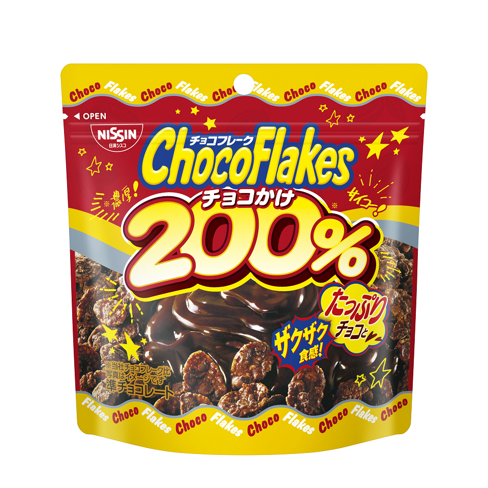 日清シスコの「チョコフレーク」史上、最大のチョコかけ量を実現。通常の「チョコフレーク」と比較して、コーンフレークにかけるチョコの量を200%にした濃厚な味わいです。鉄分、カルシウム入り。