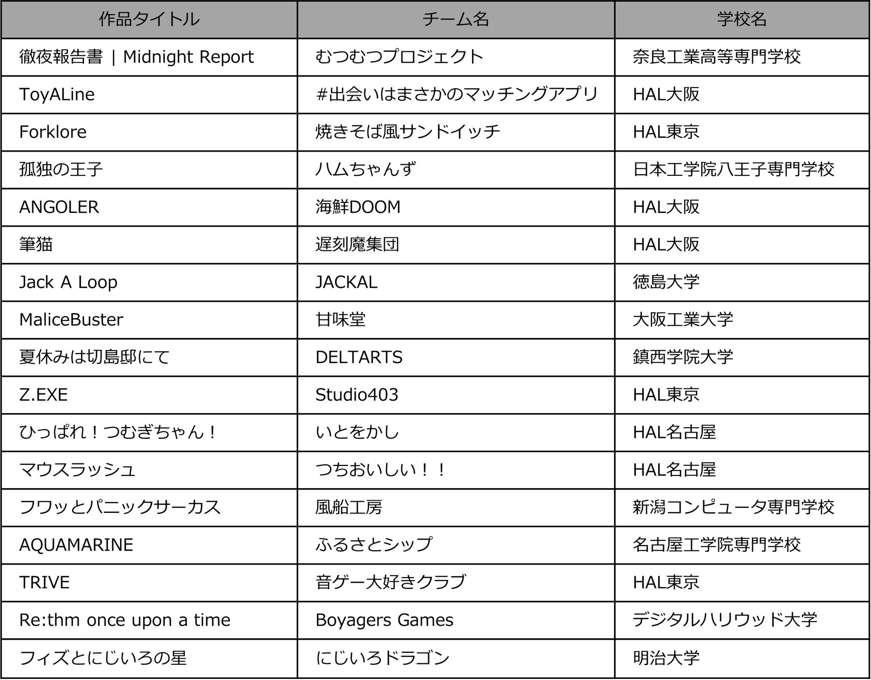 - 【ファイナルラウンドに進む13作品】(※エントリー順。学校名は代表者所属)