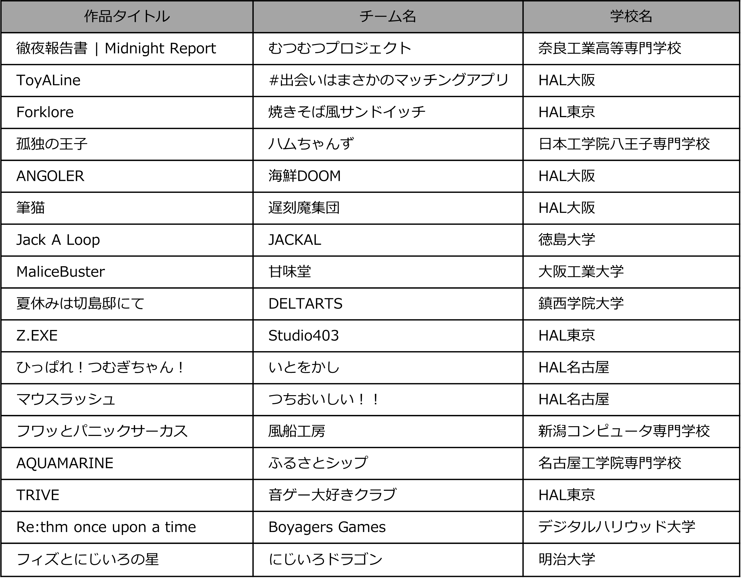 - 【ファイナルラウンドに進む13作品】(※エントリー順。学校名は代表者所属)
