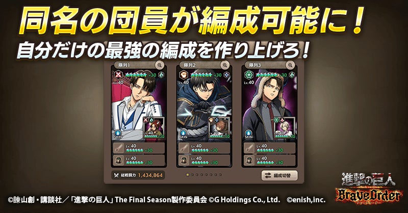 株式会社enish(本社:東京都港区、代表取締役社長:安徳 孝平、以下enish)は、アニメ『進撃の巨人』のスマートフォンゲーム最新作「進撃の巨人Brave Order」にて、12月7日(水)実装のVer1.13アップデートで巨人殲滅戦に新たな巨人が登場!また、連合対抗戦&殲滅戦キャンペーンも同時開催!さらに、本日より新登場の【黒スーツ】ケニー・アッカーマン、【調査兵団】フロック・フォルスターがピックアップされた「連合対抗戦ステップアップガチャ」も同時開催!その他、最新情報はゲーム公式サイト・ゲーム公式Twitterアカウントにて随時公開して行きますので、ぜひご覧ください。