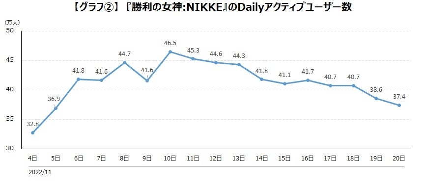 また、ユーザーの推移をDailyでみると、配信初日である11月4日のDAUは32.8万人で、その後も順調に増加し、リリースを記念した公式生配信が放映された11月6日には40万人を突破しています。11月10日には初の新キャラクターの実装があり、ユーザー数は集計期間最大の46.5万人にまで増加。その後ユーザー数は減少傾向にありますが、その減少量も他のアプリと比べても非常に緩やかなものとなっています。【グラフ➁】