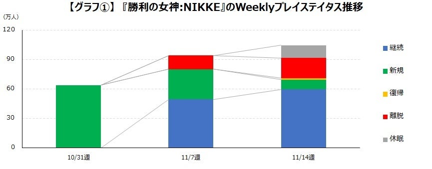 Weeklyのプレイステイタスをみると、配信日週である10月31週の新規ユーザー数は64万人。配信日は11月4日であったので、事実上配信3日間で60万人以上のユーザーを集めたことになります。また、10月31日週から11月14日週での獲得新規ユーザー数は104万人に達しました。わずか約半月ほどで100万人以上のユーザーを獲得し、その後も全体のアクティブユーザー数は常に60万人以上という高い水準で推移しています。【グラフ①】