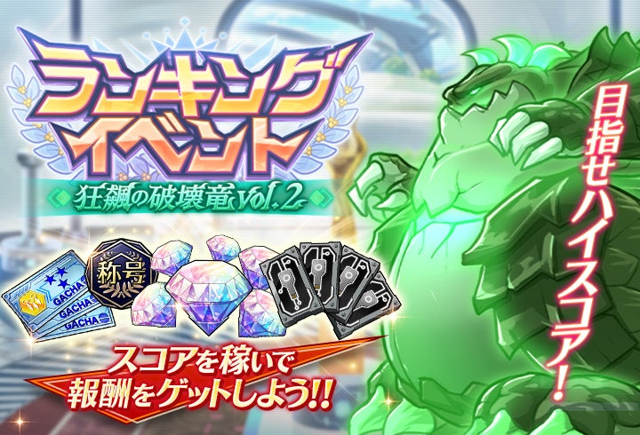 ランキングイベント「狂飆の破壊竜 vol.2」開催! 制限時間内にボスに与えたダメージに応じてスコアが決定し、スコアに応じて様々な報酬を獲得して他のプレイヤーと競い合いましょう! 今回のボスは「風」属性となりますので、「炎」属性のパーティで挑んでみてください。