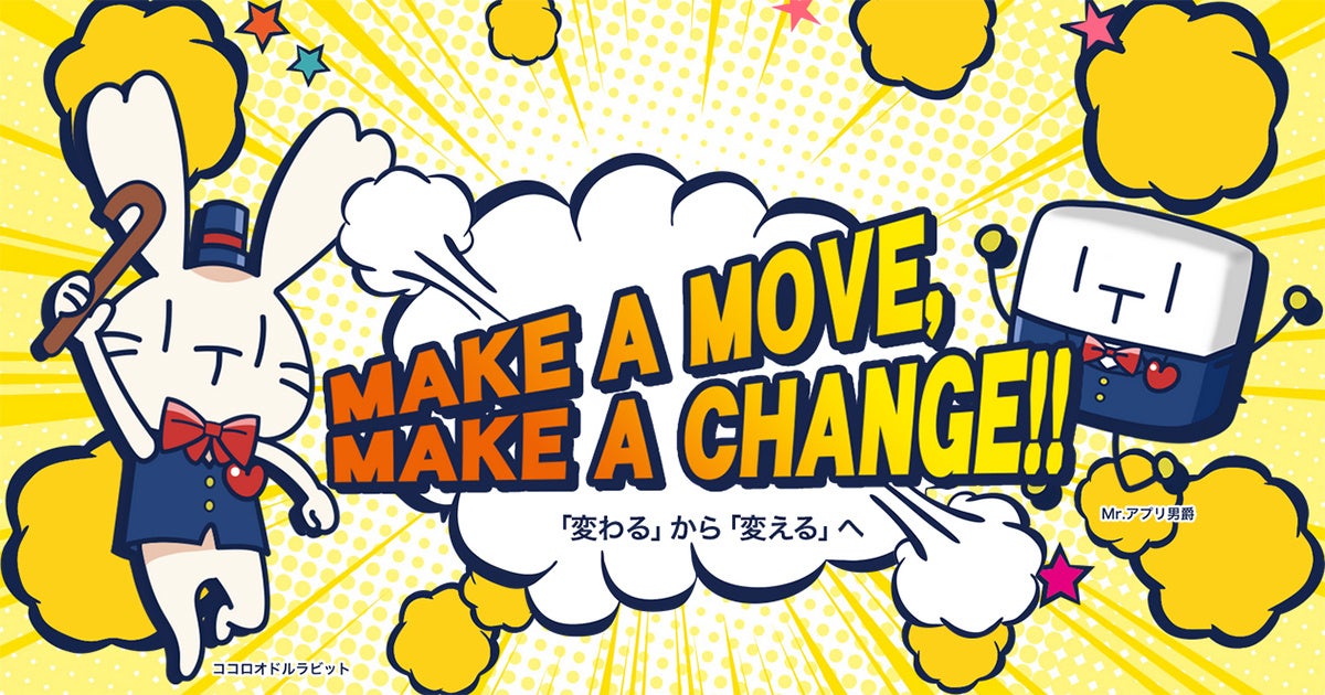 こちらは、弊社のマスコットキャラクターである「ココロオドルラビット」と「Mr.アプリ男爵」のイラストを多く使い、コーポレートサイトとは違った、ポップな感じに仕上げました。