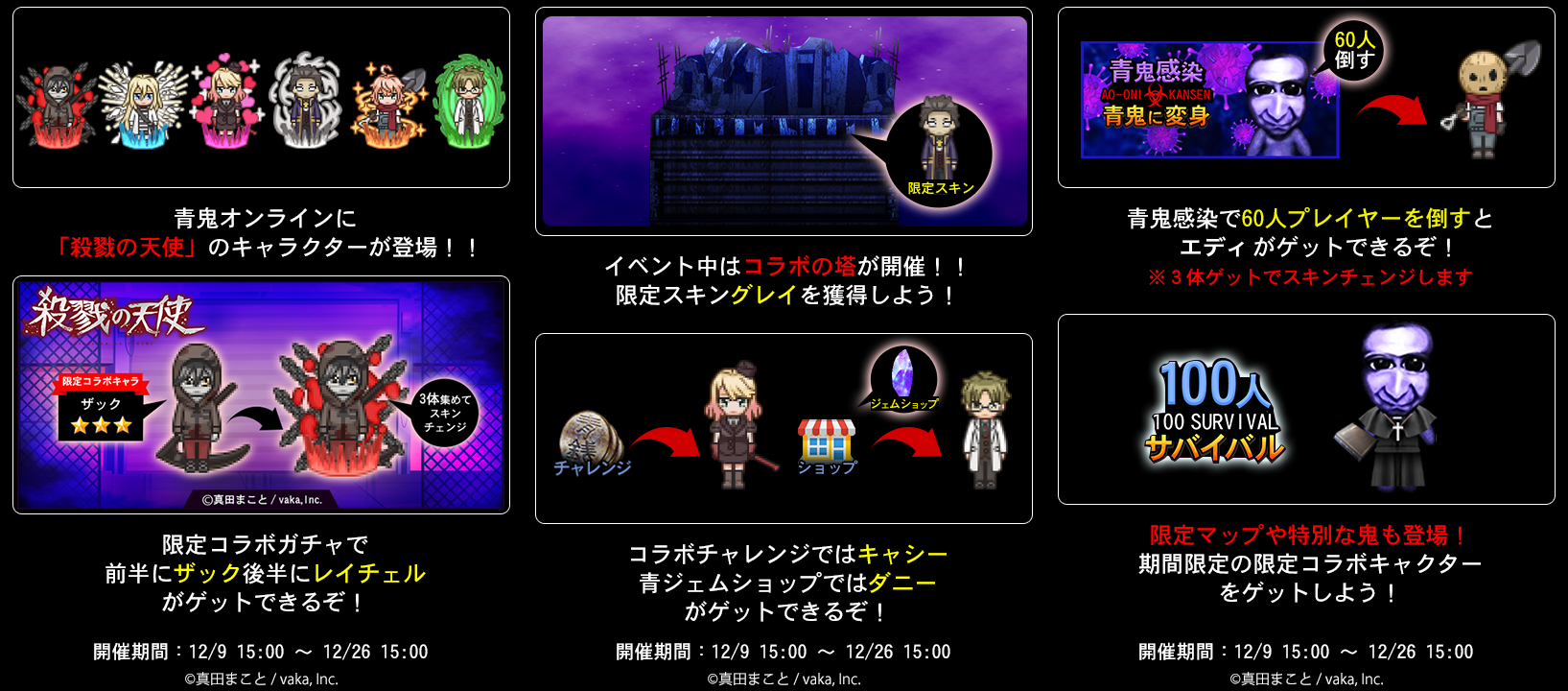 株式会社GOODROID(本社:東京都目黒区、代表取締役社長:松田和彬)は、最大100人のキャラクターが青鬼から逃げ回るマップの中で最後の一人として生き残ることを目指すオンライン・サバイバルゲーム「青鬼オンライン」にて、「殺戮の天使」コラボイベントが12月9日15:00より開始したことをお知らせいたします。