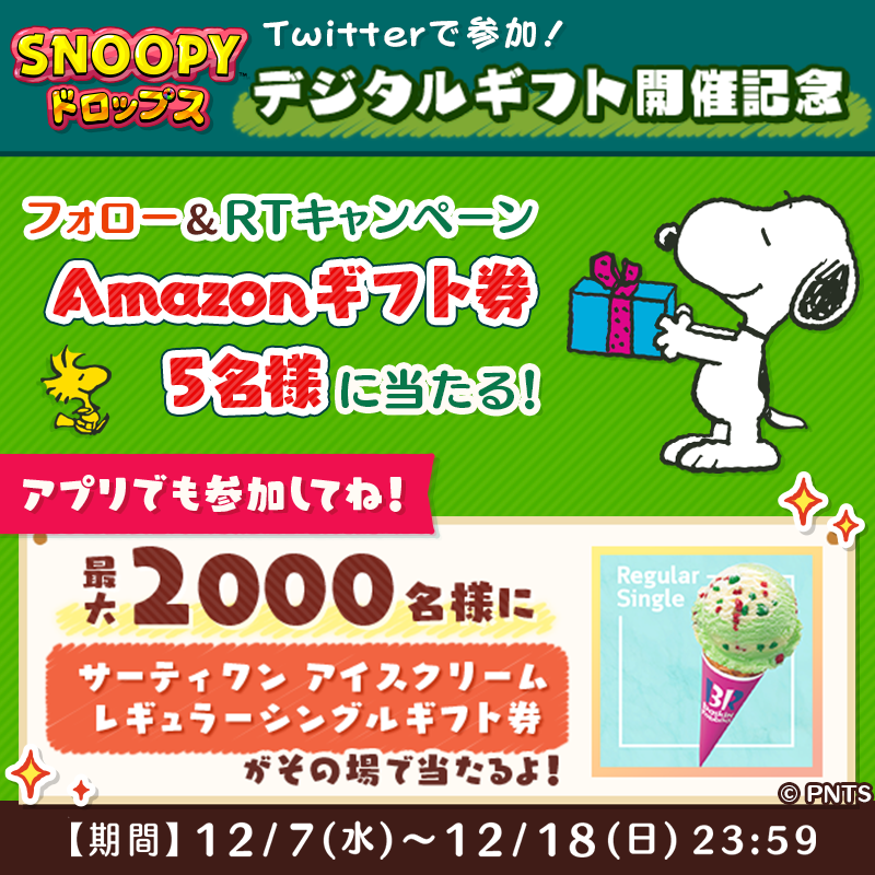 公式Twitter『スヌーピードロップス』をフォローしてリツイートするだけなので、皆さん奮ってご参加ください!