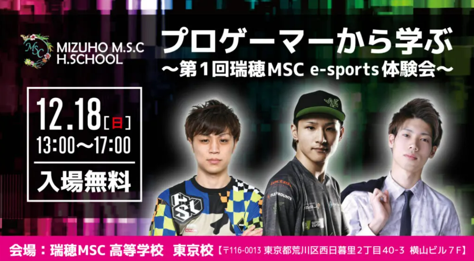 学校法人みずほ学園が設置構想中のNET高校、瑞穂MSC高等学校(設置構想中)は、2022年12月18日(日)に11月に完成した東京校(日暮里)で『プロゲーマーから学ぶ~第1回瑞穂MSC e-sports体験会~』を開催します。Fusion LLC.は体験会の制作支援を行わせていただきます。