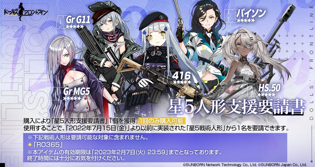株式会社サンボーンジャパンは、スマホ向け戦略型シミュレーションゲーム『ドールズフロントライン(以下、「ドルフロ」)』において、強力な敵対勢力を捕獲できる「捕獲作戦」に新たな区域『SP5NANO地区凍える氷原』と★3ユニット「デストロイヤー-浮掠麋影(ふりょうびえい)」が登場することをお知らせいたします。