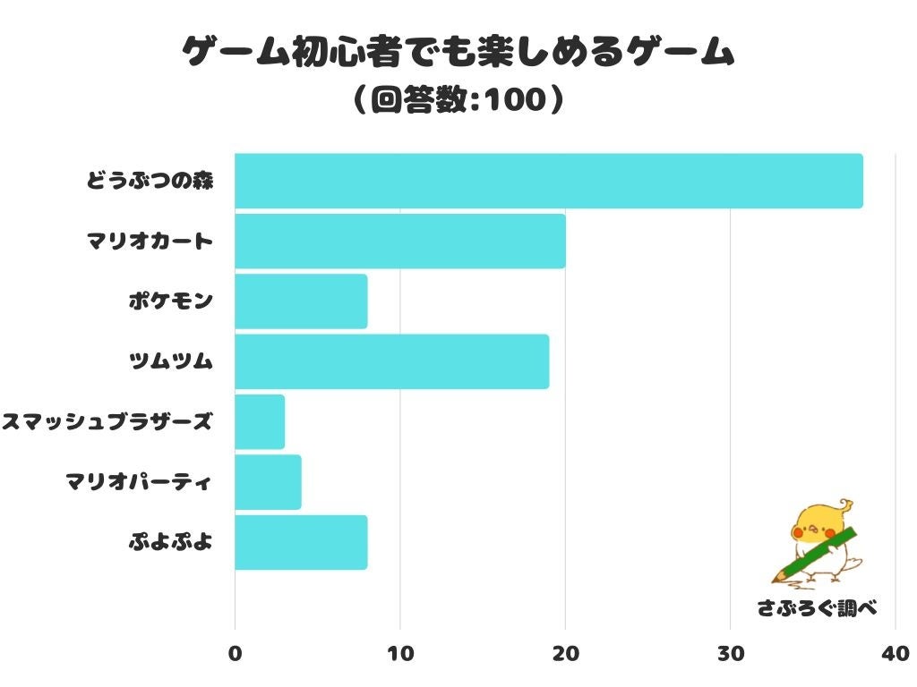 ゲーム初心者でも楽しめるゲームをアンケートにて調査したところ、1位は「どうぶつの森」でした。