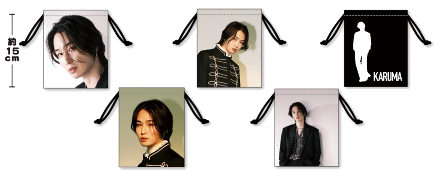 『カルマ』の写真やシルエットを使用したクールなデザインの巾着ポーチ。