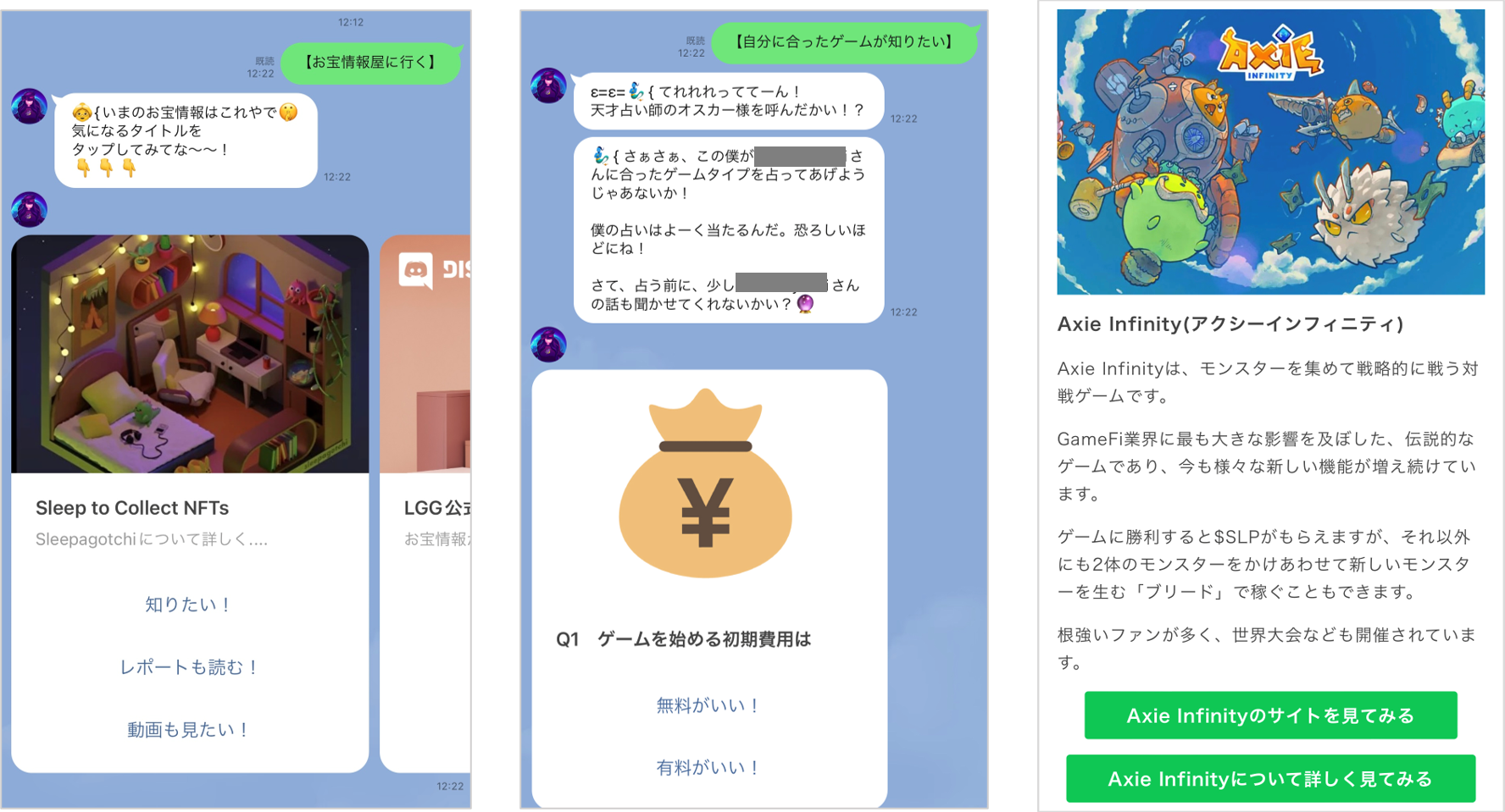 LINE公式アカウントでは、診断形式で自分の傾向にあったNFTゲームを見つけることができます。
